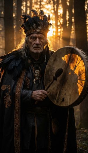 Mellette hatalmas dézsa víz, nyakig merülök benne. Vízasszony lecsutakolja testem. Kilépek, felveszem az előkészített tollas köpenyt, fejemre illesztik az agancsos fejdíszt. Szemem előtt szalagok. Léptemre csöngettyűk zengenek. Talpam alatt harmatos fű, fejem felett csillagok, tűz ég, körötte emberek. A hatalmas máglya fénye vörösre festi a körben állókat. Szikrák szállnak az ég felé. Dobok hangja szól, csörgők csörrennek.